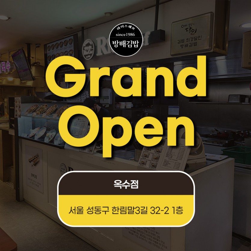[지금 방배김밥은] 옥수점 오픈 본문 지난 16일에 옥수점이성황리에 오픈했습니다^^많은 관심 부탁드려요!! 이전글[지금 방배김밥은] 2025 하반기 K-푸드+ 바이어초청 수출상담회(BKF+) 참여 25.10.30 다음글[지금 방배김밥은] 영문월간지 KOREA BUYERS GUIDE 10월호 브랜드 소개 25.09.26 목록 목록 답변 댓글 0 댓글목록 등록된 댓글이 없습니다.
